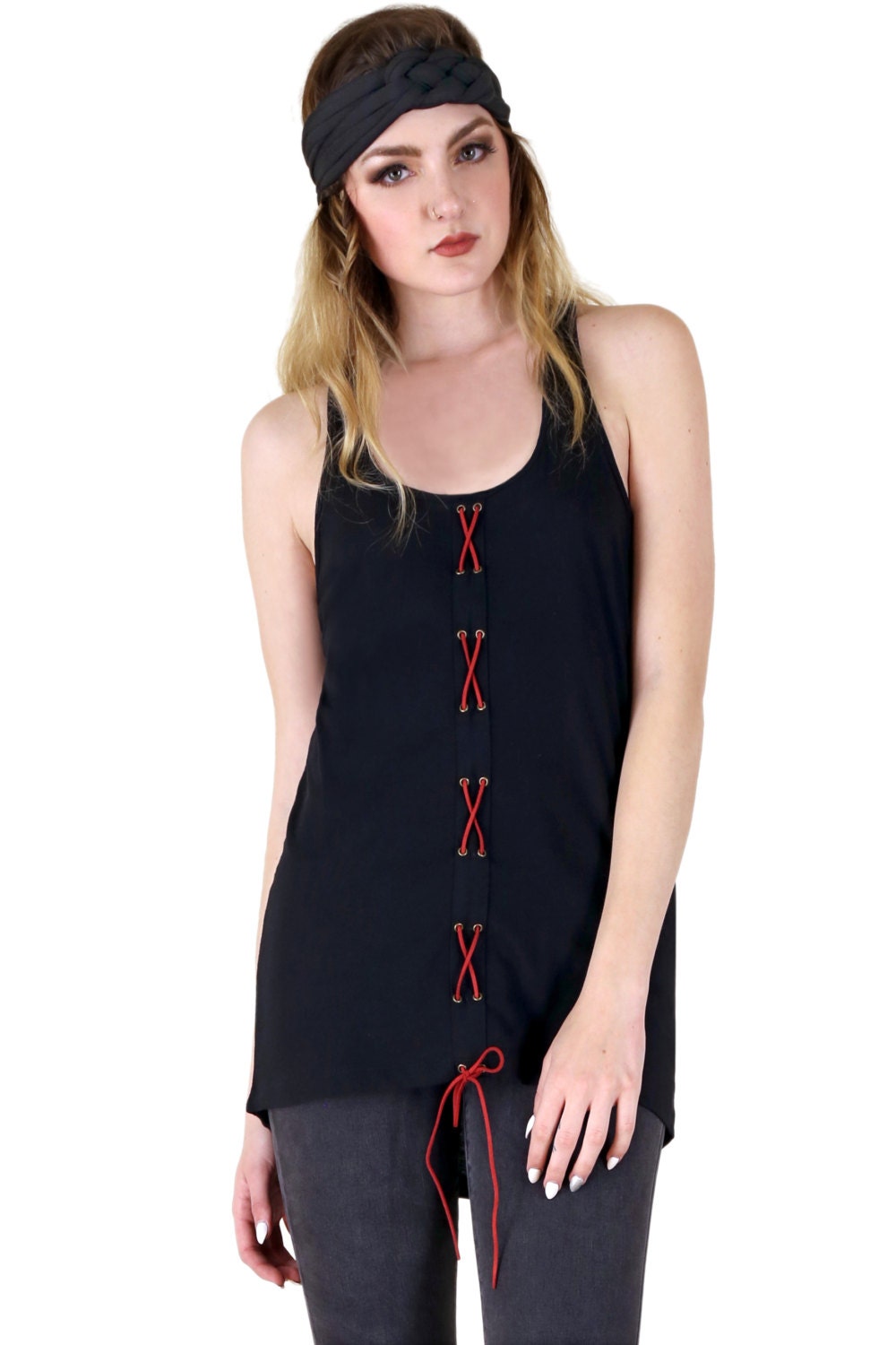 Vintage looking, lose fitting tank top. Antique brass eyelets that lace up the front with a suede cord.