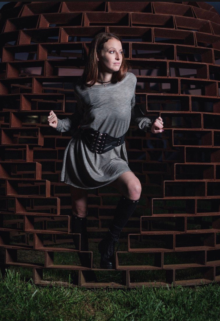 A-Line long sleeve Dress features neckline embellished with silver grommets, raw cuff and bottom hem, fit and flair silhouette, and light weight vintage washed fabrication.